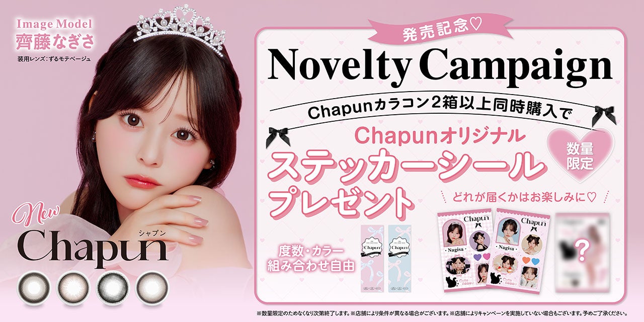 2025年3月21日(金)に映画【推しの子】出演でも話題の、齊藤なぎさがイメージモデルを務めるカラコンブランド『Chapun(シャプン)』を発売。また発売を記念し、『Chapun(シャプン)』2箱以上同時購入でオリジナルステッカーシールがもらえるノベルティキャンペーンを実施。