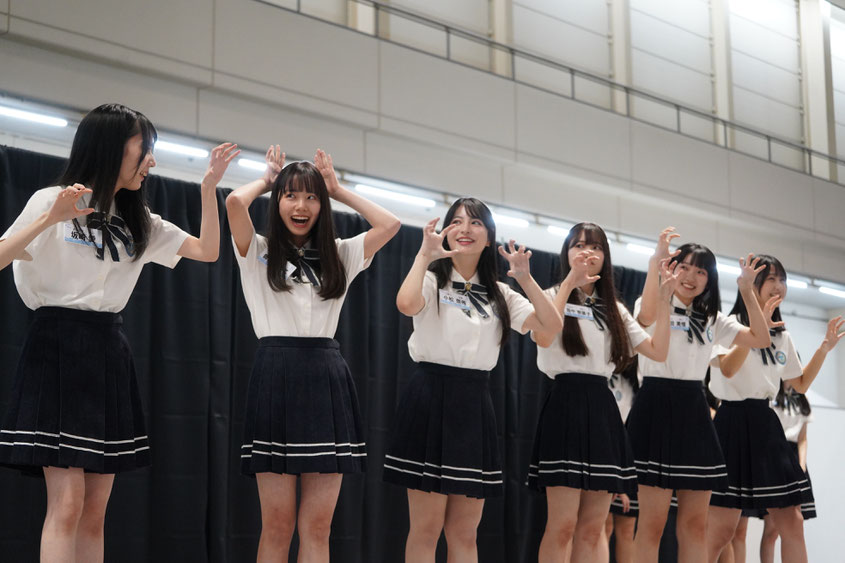 握手会前には、「はじめまして、STU48 4期研究生です。自己紹介ミニステージ」と題したステージ企画が実施され、MCを務めたキャプテン・岡田あずみと内海里音の呼び込みで18名が登場。研究生たちは声を揃えて「みなさん、初めまして。STU48 4期研究生です」と少し緊張した面持ちで挨拶すると、温かな拍手がステージを包んだ。