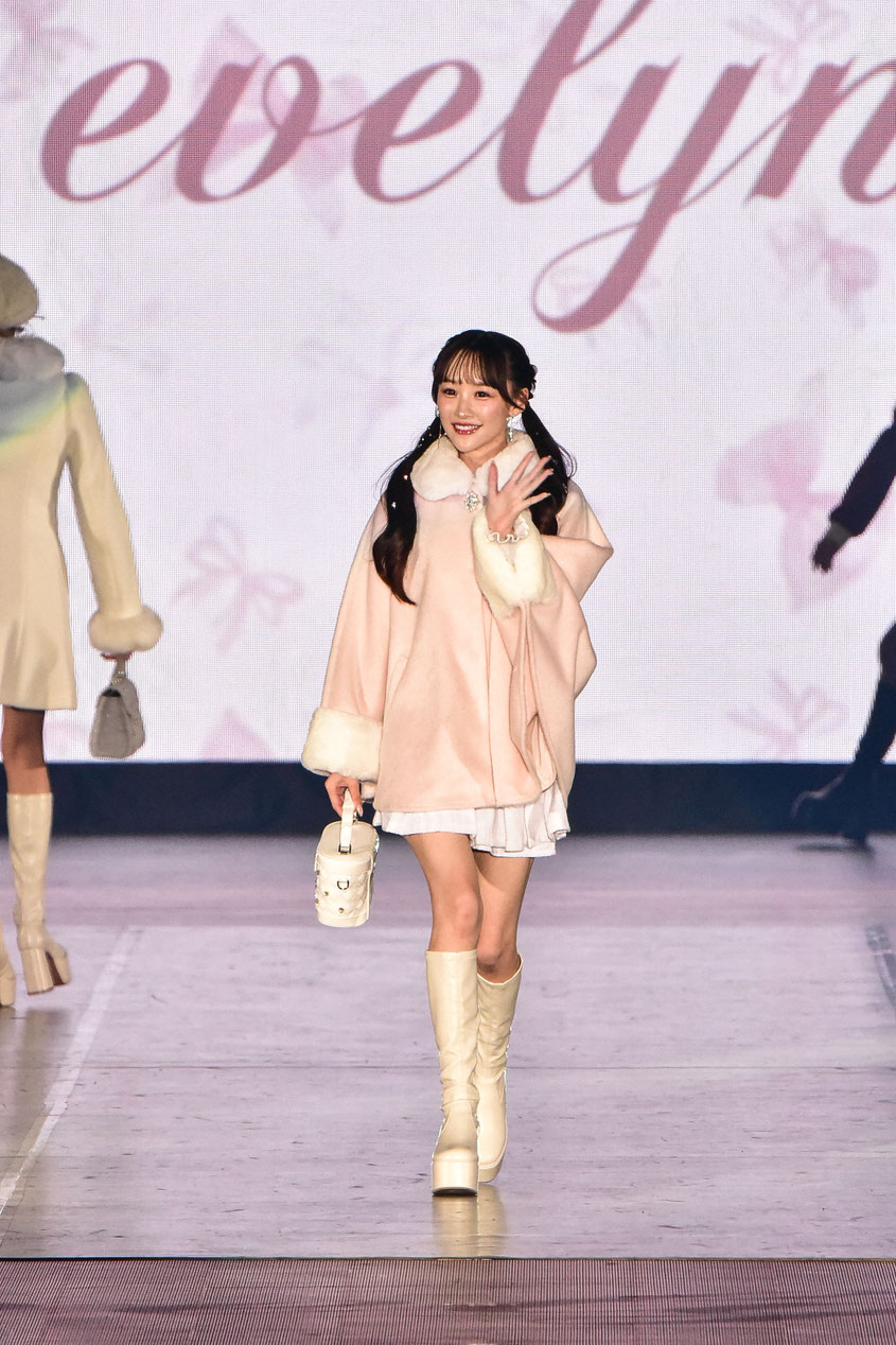 =LOVE ⾳嶋莉沙がevelynのランウェイを闊歩。ピンクのコートに白のミニスカート、ロングブーツで魅了。